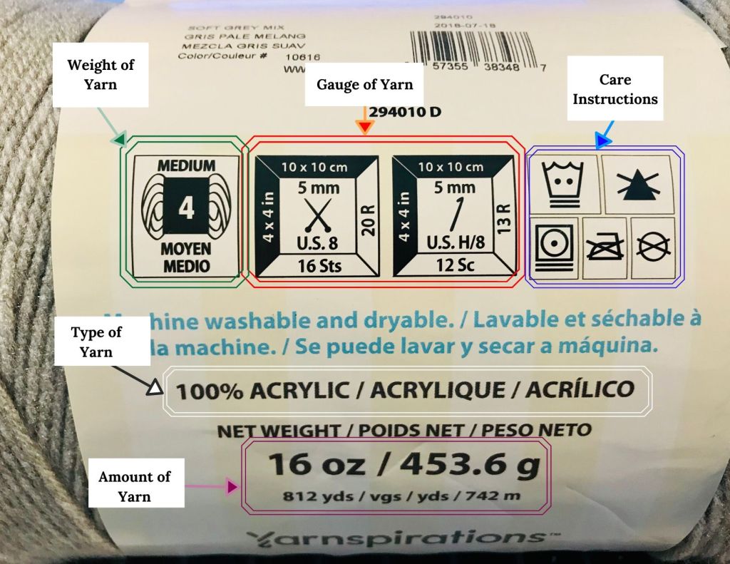 Each label is laid out very different. This is from one of my recent projects (Pound of Love from Yarnspirations). You will usually see the weight/type, gauge/hook&needle recommendation, care instructions, and how much yarn is in the skein.