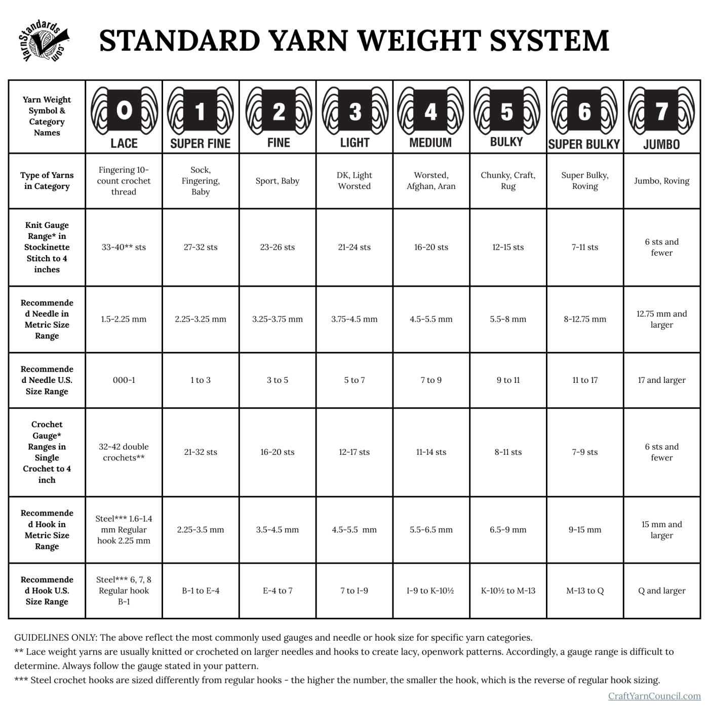 I grabbed this chart from Craft Yarn Council | Yarn Weight System Standards website. This is based on the ‘industry standard’ and can vary a titch from brand to brand.